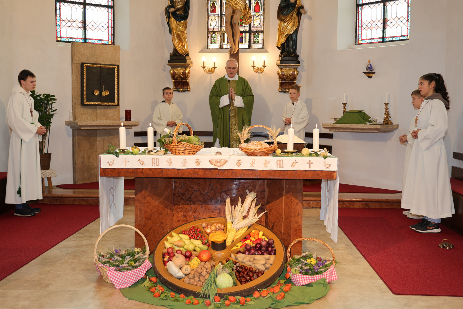 Traditionell am ersten Sonntag im Oktober, heuer 06. Oktober 2024, feierte die Pfarrgemeinde Immendorf das Erntedankfest. Auf dem herbstlich geschmückten Altar mit den Körben Brot und Wein, sowie einem mit verschiedenen Früchten verzierten "Ernterad" (altes Wagenrad) vor dem Altar zelebrierte Pfarrer P. Mag. Michael FRITZ OSB. die Hl. Messe und segnete die Erntegaben. Musikalisch umrahmt wurde die Festmesse vom Jugendmesschor Immendorf unter der Leitung von Tanja TRAPPL. Pfarrer P. Michael segnete nach der Messe auch die Erntegaben der Kinder.